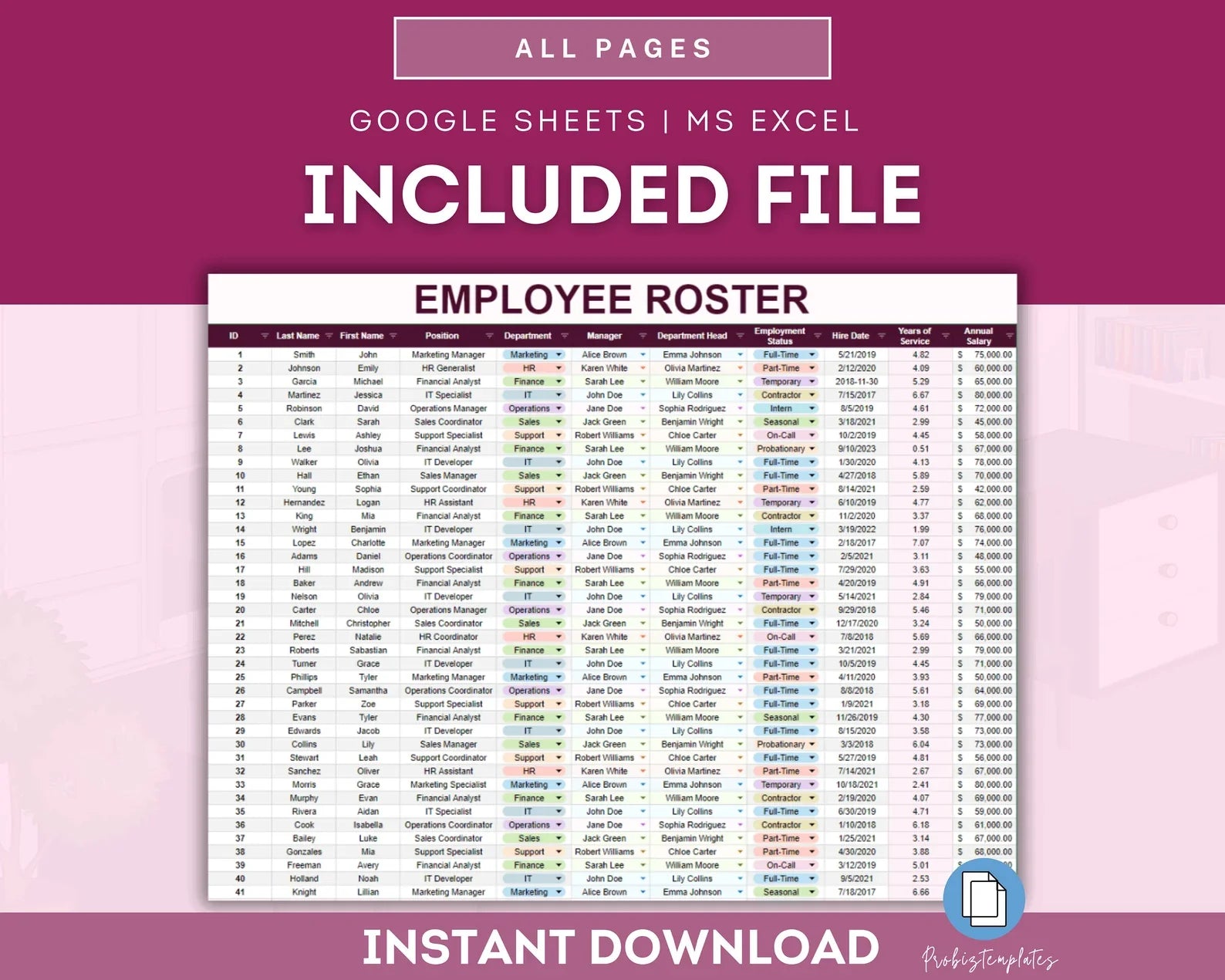 Employee Roster Template, Staff Database Template, Personnel Records Repository Template, HR Database Microsoft Excel Google Sheets Template